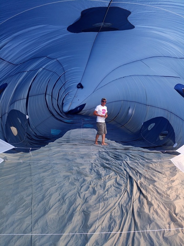 Эта большая тушка сделана из довольно тонкого материала, поэтому в ней могут появляться разные отверстия. Учитывая размеры, осмотр кита в сдутом состоянии занимает уйму времени, а про качество такого осмотра говорить и вовсе не приходится. Поэтому проверка и локальный ремонт проходит так ( на фото - наш друг из Санкт-Петербурга, команда SPBKites):