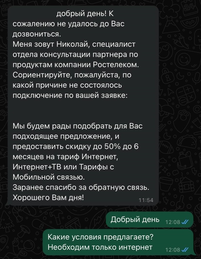 Добрый вечер товарищи. Примерно с месяца три назад, подал заявку на подключение к домашнему интернету от Ростелеком (далее Ростик). Спустя время мне перезвонили, поговорив с оператором понял, что переходить от нынешнего провайдера смысла нет и отказался от подключения. Спустя некоторое время, в WhatsApp мне стучится менеджер от Ростика и предлагает условия, от которых отказаться я таки не смог.