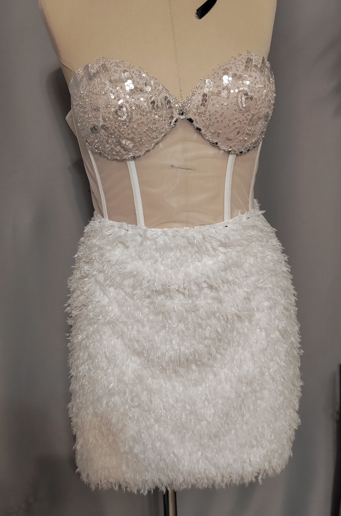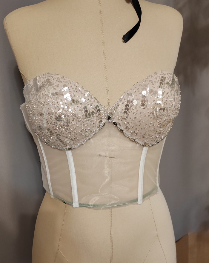 Пожелания: перья это геморно, облетают, поэтому меняем на имитацию, юбка прям мини-мини, верх должен быть из белой корсетной сетки, на неё нашить крупные стразы, чашечки беж, которые перекрываем стразами по возможности все. Материалы все есть. Ок, дело не сложное, берусь.