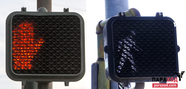 «Солнцеустойчивые» светофоры с запрещающей (слева) и разрешающей (справа) индикацией