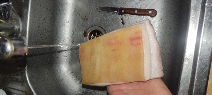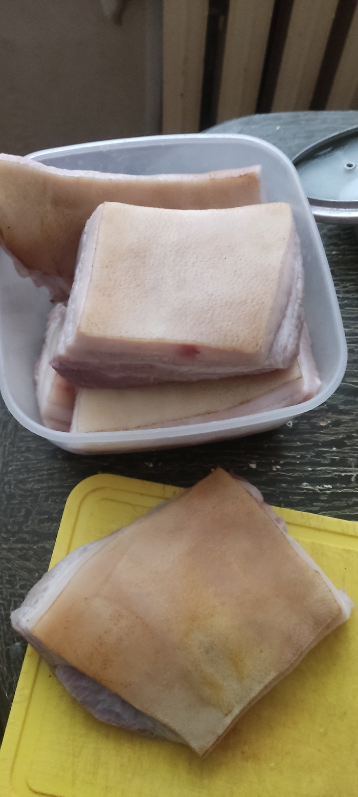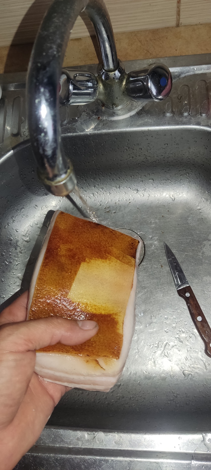 Сало, если из магазина, в первую очередь нужно засмолить. Не жалея, до пепла.