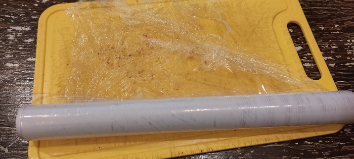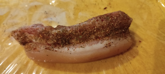 Сало не обваливаю, а обсыпаю своей приправой и закручиваю в плёнку.