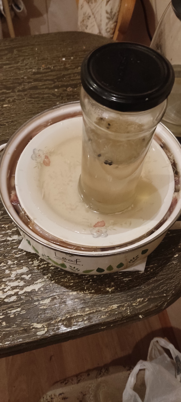 Оставляем на 1 сутки при комнатной температуре, ( после этого можно груз снять), потом 1 сутки в холодильнике.