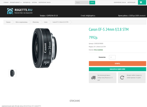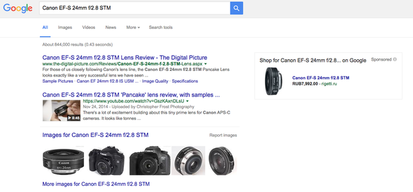 В конечном счёте заинтересовал меня объектив Canon EF-S 24mm f/2.8 STM. В моём городе такой стоит от 10к рублей. И всё бы ничего, но наткнулся я в поиске вот на это предложение (справа реклама Google):