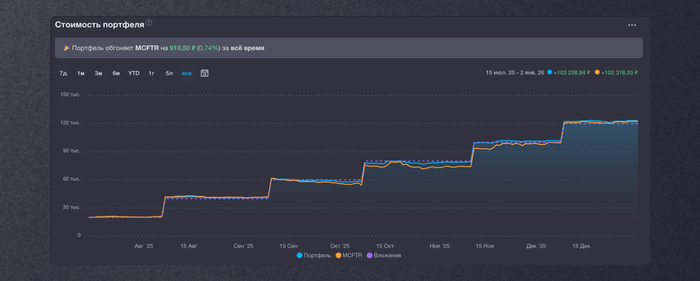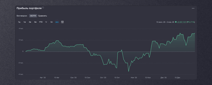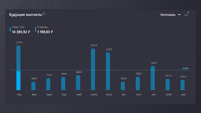 В среднем перед январским пополнением (а я его уже сделал) что-то в районе 1200 ₽ в месяц или 14 401 ₽ в год. Мало? Да. Страшно? Нет. Потому что каждый новый месяц +30 000 ₽ пополнения, и выплаты будут расти. Рост — это то, что мы любим 😉.