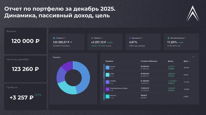 Привет, инвесторы! А вот и ежемесячный отчет по пассивному доходу, который в декабре был скромным, но он был — и это главное.