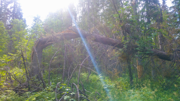 Пробираясь через лез, порой встречали весьма интересно поваленные деревься, как будто какой то горный тролль резвился.