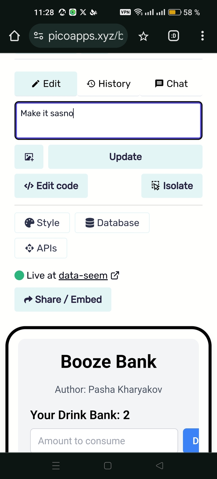 Весь процес создания занял пару часов: 1.объяснить нейросети что тебе нужно в общих чертах, получить полурабочее кривое и страшное приложение. 2. Объяснить ей что что-то не работает как положено, попросить внимательно проверить код и исправить. 3. Добавить другие функции, кроме самого счётчика и окошка ввода(кнопка описания, ачивки и система лиг). 4. Исправить новые функции. 5. Обнаружить, что базовые функции перестали работать 6. Попытаться договориться об их исправлении. 7. Написать подробный промпт и попросить переписать всё приложение с чистого листа. 8. Исправить что получилось. 9. Попросить сделать привлекательный дизайн(та же история что в шагах 1-8)