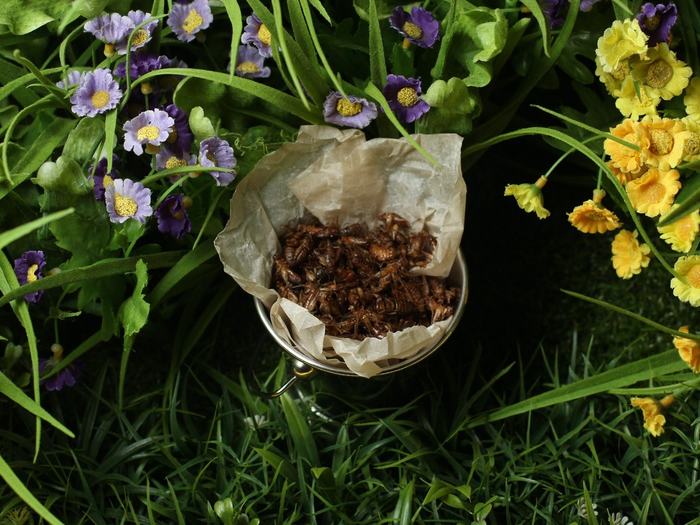 Сверчки — продукт белорусской фермы Crickets.by, где уверяют, что выращивают «закуску» в атмосфере любви и заботы. В «Клумбе» сверчков размораживают и обжаривают в масле (то есть получается не то чтобы «супер diet»).