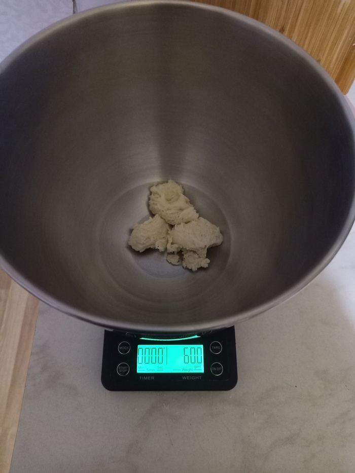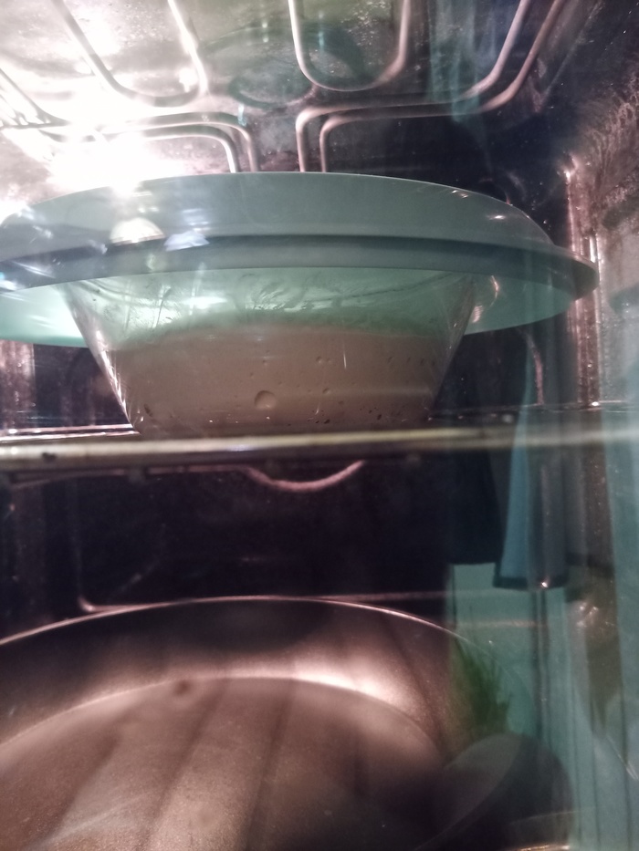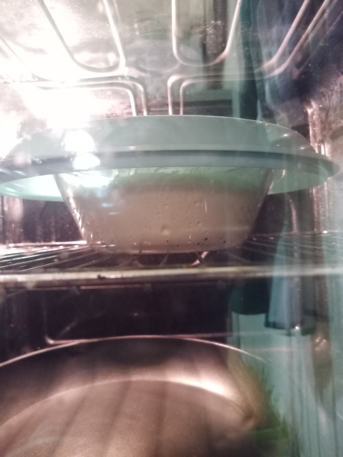 После этого кладу тесто в прозрачную посудину, чтобы следить как оно поднимается и убираю в духовку с включенной лампочкой. Температура в духовке 28-29 градусов, главное чтобы выше 29 уже не поднималась. Жду пока тесто поднимется примерно на 20%