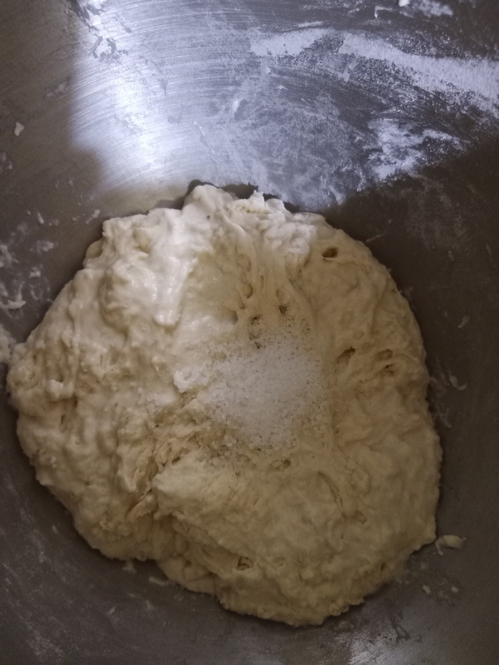 Спустя час добавить соль и замешать, пока соль не станет равномерно распределена по тесту. Я использую соль среднего помола.
