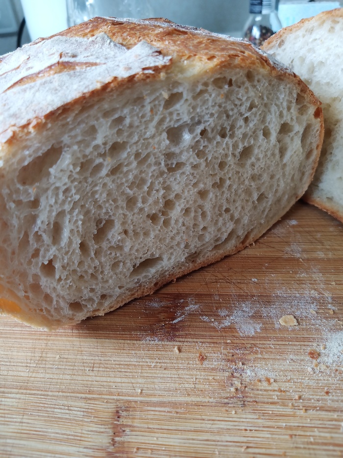 Выпекается 15 минут с водой, потом вода убирается и ещё 15 минут при 250°. Можно больше если хочется более румяный или меньше если менее. Когда время вышло выключаю духовку и оставляю её приоткрытой, держу так хлеб ещё 15 минут