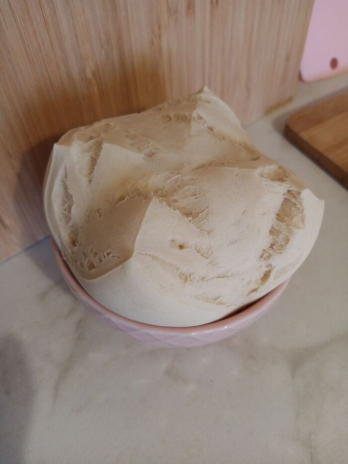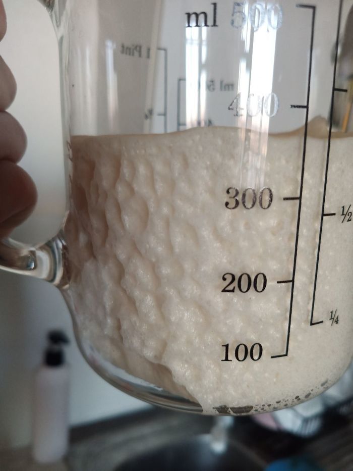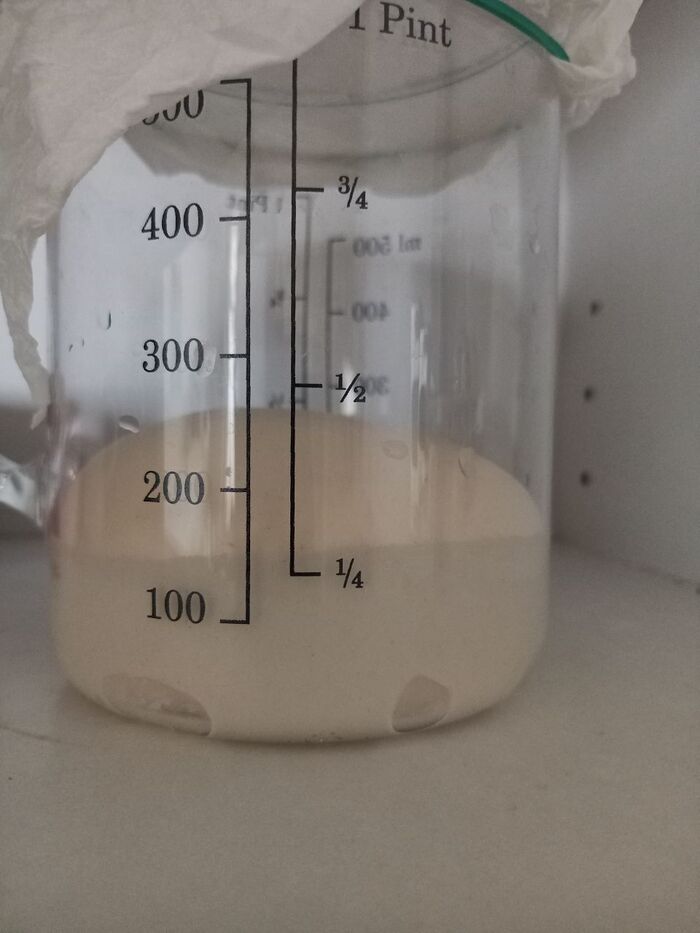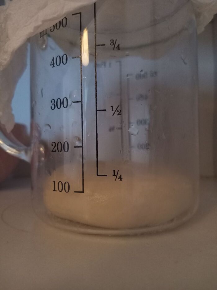 Теперь нужно за ней наблюдать, чтобы определить как часто обновлять. Пока она растёт, на верхушке получается небольшой купол, затем начинает немного оседать. Если это произошло за 12 часов (как у меня) значит и обновлять её нужно дважды в день, утром и вечером. Если это занимает больше времени или пока не оседает, то соответственно раз в сутки. Главное чтобы она выросла хотя бы в два раза. Мыть банку обязательно каждый раз. Если вы обновляете два раза в сутки, то готова будет примерно через две недели, если один раз, то 3-4 недели. Определить готовность можно по запаху, мне он напоминает йогурт. И готовая закваска увеличивается в 3-4 раза за 4 часа.