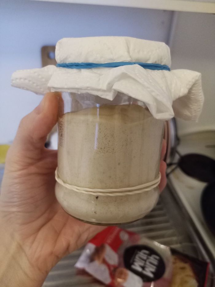 Например 50г закваски/50г мука/25г вода и чуть-чуть меда 1-2г. Пока закваска готовится нет смысла делать много, я придерживалась именно этих пропорций. Остатки закваски выбрасываются, есть её пока нельзя.
