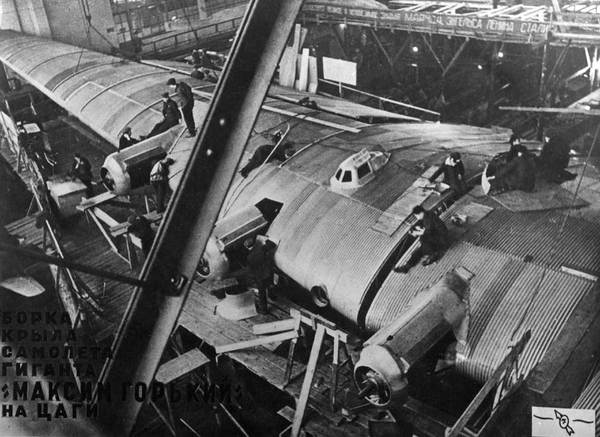 В 1932 году, в группе писателей и журналистов, в день 40-летнего юбилея литературной деятельности Максима Горького родилась идея построить АГИТсамолёт, назвав его в честь писателя «Максим Горький». Был создан Всесоюзный комитет по строительству самолёта, по всей стране начался сбор денег на постройку, давший в короткий срок около 6 млн рублей. Комитет организовал в своём составе Технический совет под председательством начальника ЦАГИ Харламова, которому поручил определить лицо будущего самолёта и разработать технические требования, исходя из основных назначений самолёта. Прошло пару лет, данная махина была построена, силовая установка которой, состояла из восьми двигателей. Шесть двигателей располагались на крыльях, два — в тандемной установке над фюзеляжем. Винты деревянные, диаметром 4 м. Изначально предполагалось установить шесть двигателей, но их мощности оказалось недостаточно.