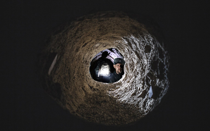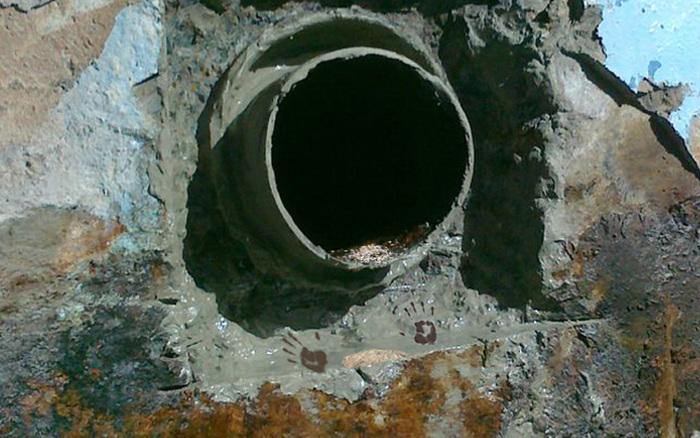 Прибывшая на место группа оперативного расследования, разорвала плакат, за которым находилось большое отверстие диаметром 70 сантиметров, являющееся началом свежевырытого тоннеля вглубь стены.