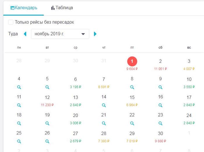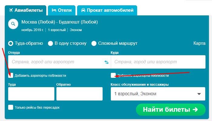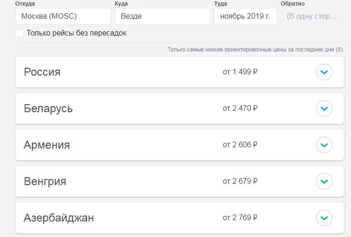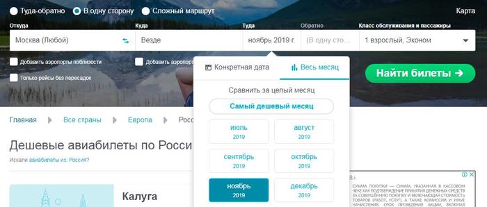 Он мне нравится больше других, так как дает возможность выбирать наиболее бюджетное направление на заданный период. Для этого я смотрю, куда полететь дешевле всего, например, в ноябре. А пункт назначения оставляю либо пустым, либо пишу слово «везде».