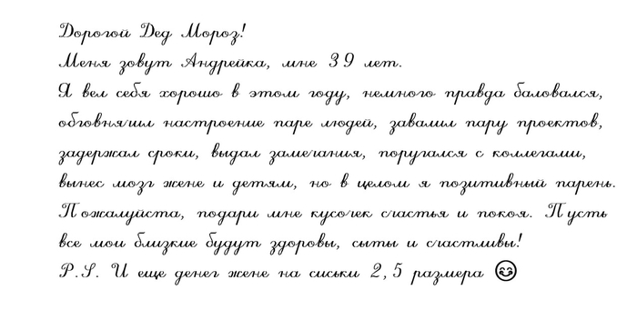Вот уже и новый год на дворе. Дети написали письма Деду Морозу. Супруга тоже составила письмо, где указала много подарков для себя любимой, но один запрос-подарок был не указан. Из-за работы мне приходится далеко уезжать и работать вахтой, но уже совсем скоро буду дома с семьей. Решил её поддержать и написал свое письмо, вместе посмеялись.