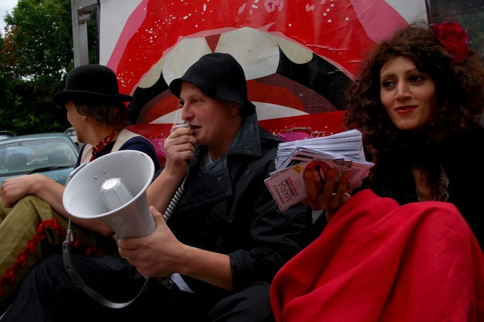 Да, мы нелегально клеили наши афиши черти где, их потом быстро убирали коммунальщики, поэтому приходилось тоже устраивать перформансы.