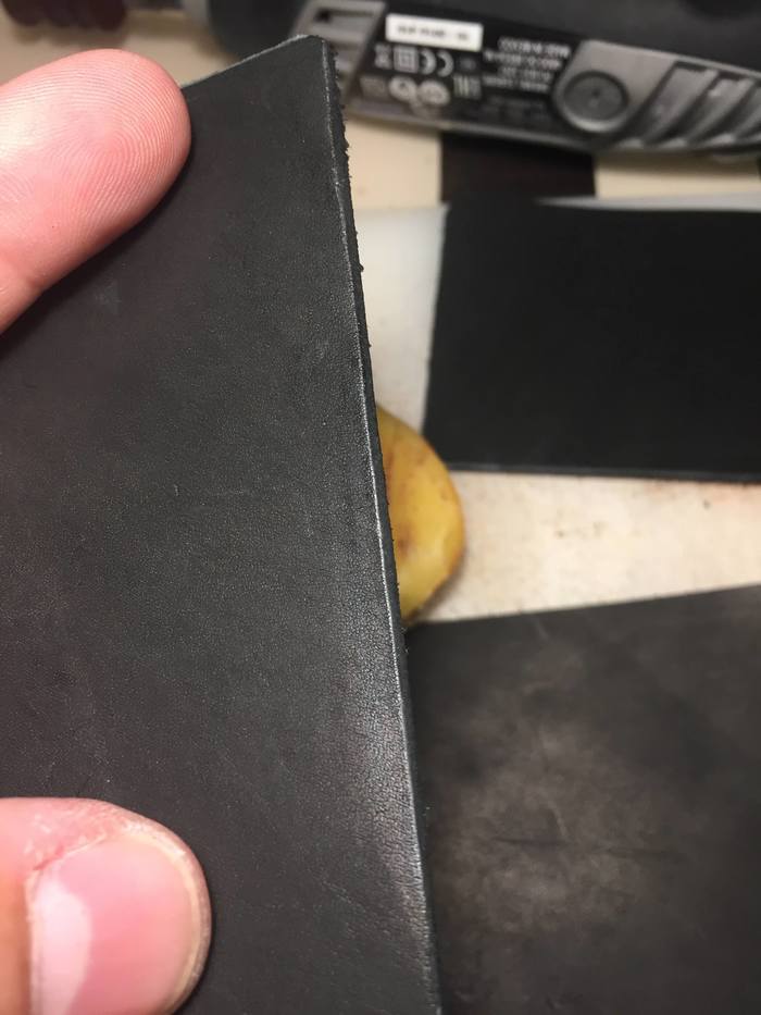 Торцбилом снимаем фаску. На оборотной стороне будущего кардхолдера по 4-м сторонам. На лицевой - верх и бока от 7 см и выше. На куске 7х11 - верх и бока от 5 см и выше. Это делается для того, чтобы не было щели в кусках кожи, когда мы их сложим вместе. На куске 5х11 снимаем полностью.