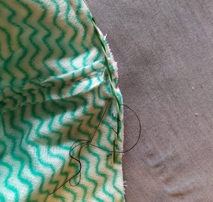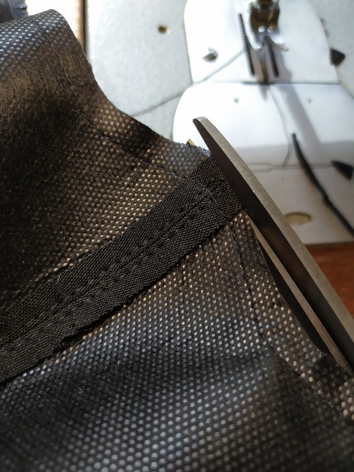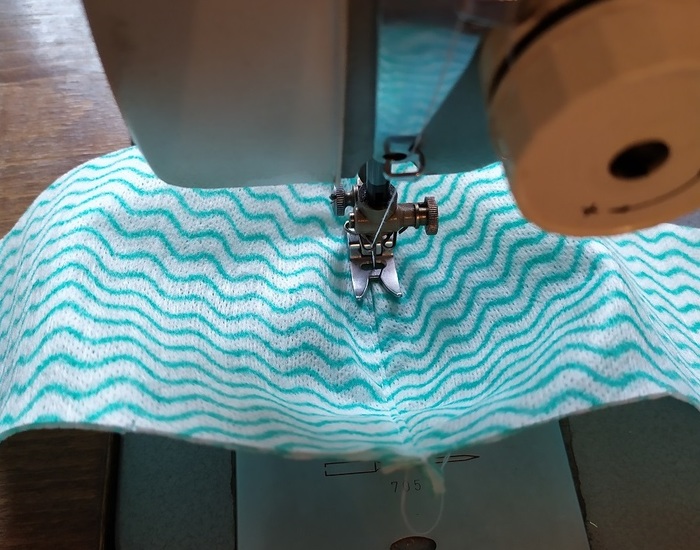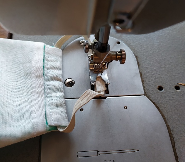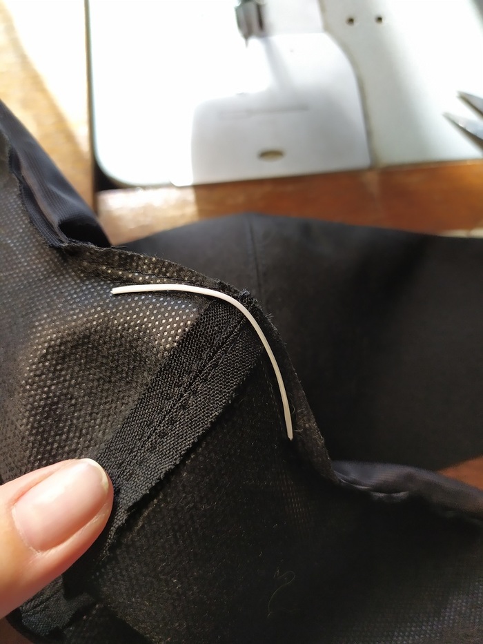 7. Добавляем проволоку. Она очень важна, она обеспечивает прилегание маски к лицу в области носа. Проволоку надо закрепить по верхнему краю маски от надсечки до надсечки на припуск шва со стороны фильтра. Можно сделать это вручную иголкой с ниткой или на машинке зиг-загообразной строчкой, если у вас такая есть.