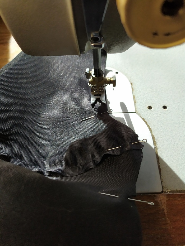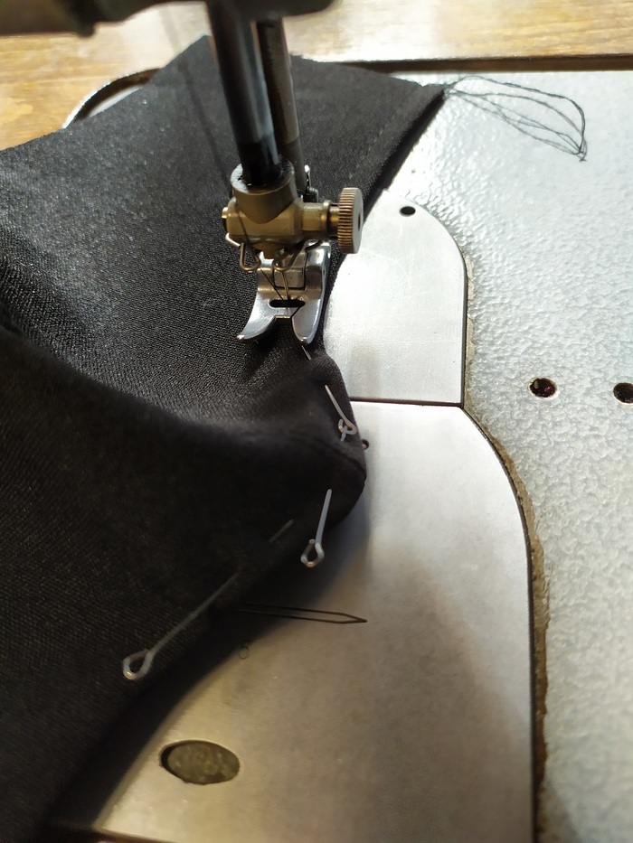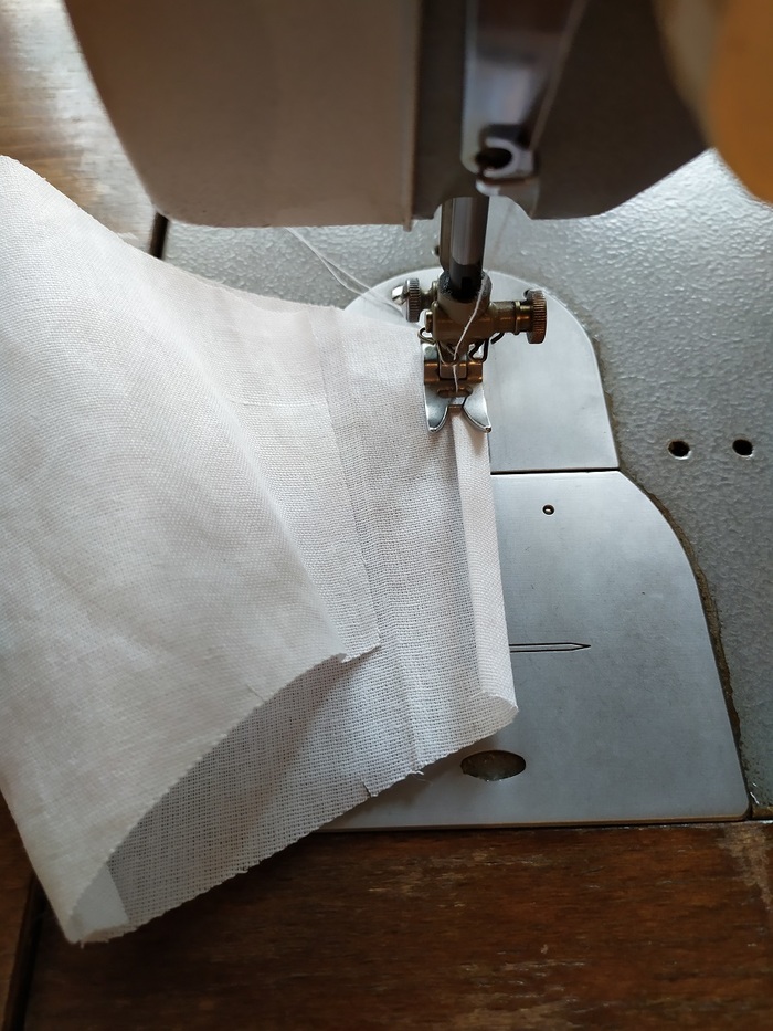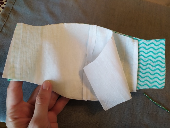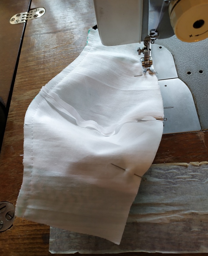 9. Обрабатываем боковые стороны маски. Для этого подгибаем все слои вместе на 1 см и еще на 1,5 см, прошиваем.