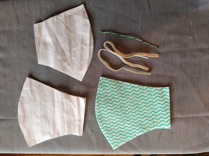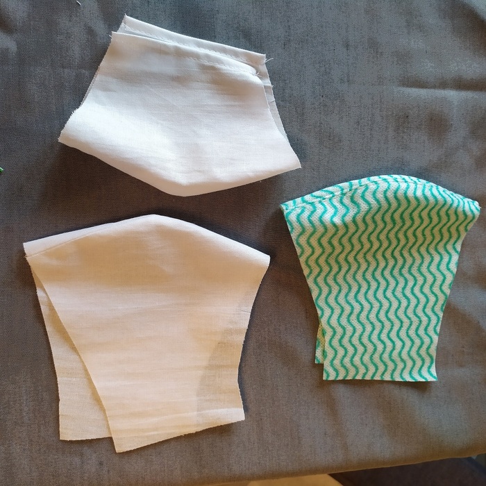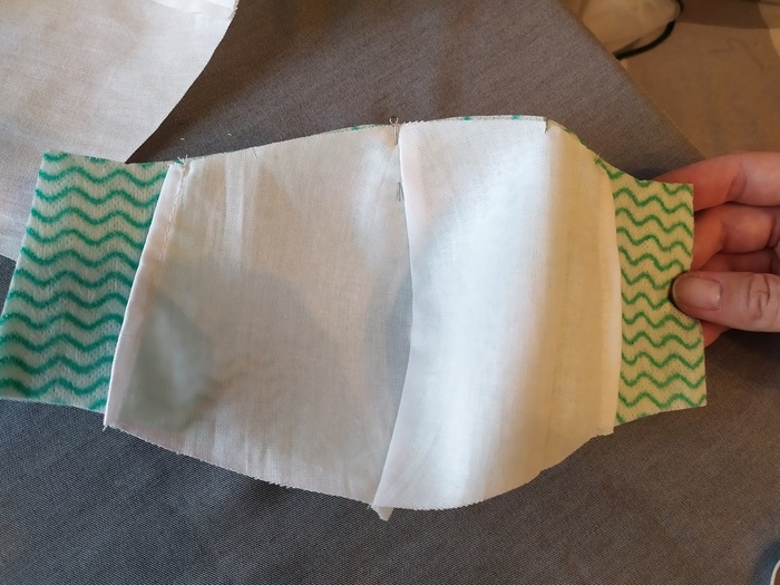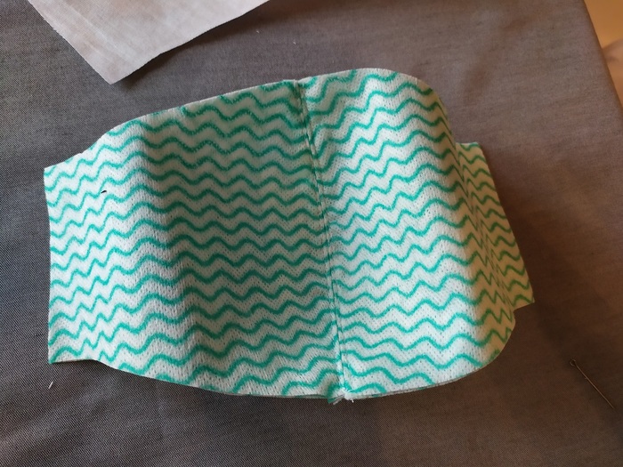 По советам комментаторов делаем внешний слой из хлопка, фильтрующий слой из нетканого кухонного полотенца (такие в рулонах продаются) или спандбонда, по наличию. Я делала из тряпки для пыли:) в 2 слоя (получилось душно, лучше 1 слой и по необходимости вкладывать сменные фильтры в нужном количестве во внутренний карман маски).