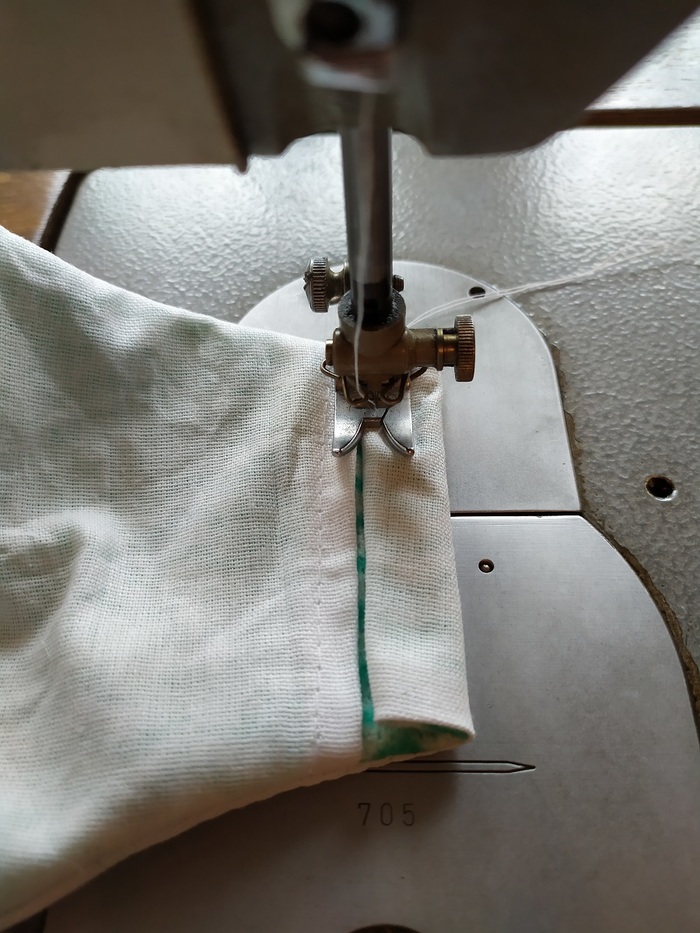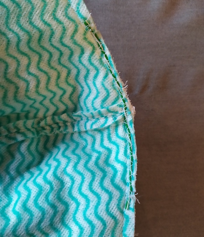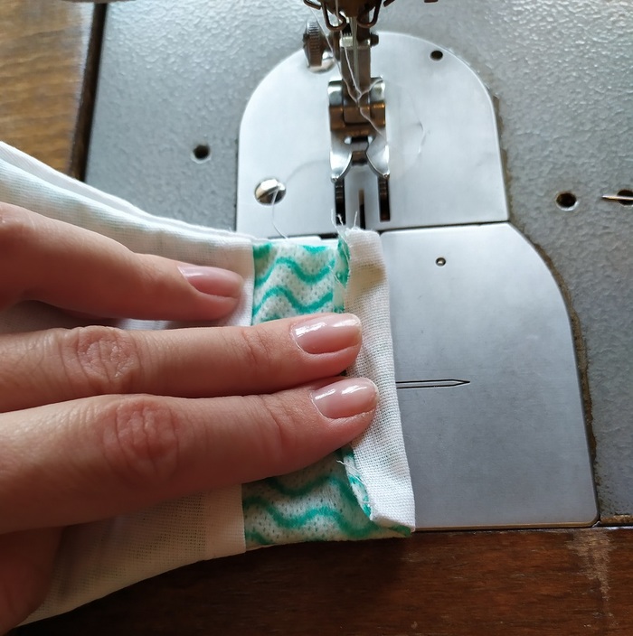 3. Обрабатываем края внутренней детали - это та, которая поменьше (я назваю ее клапан или карман, под нее будем засовывать сменные фильтры). Нужно подогнуть край ткани два раза и прошить.