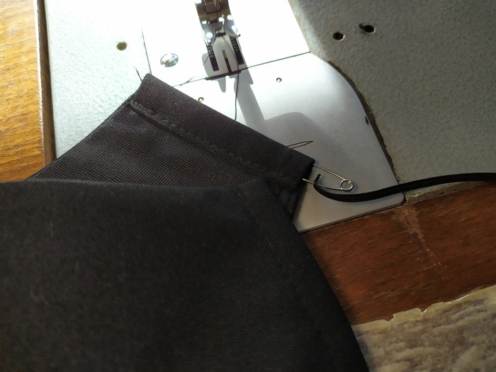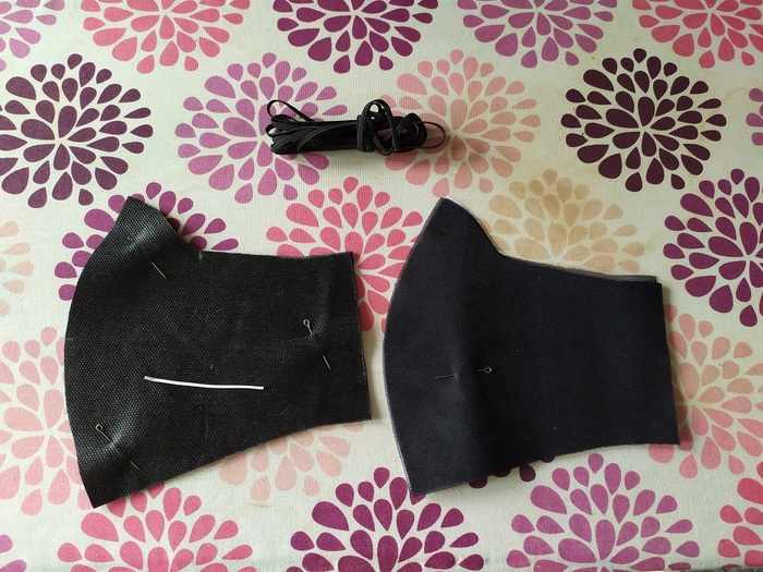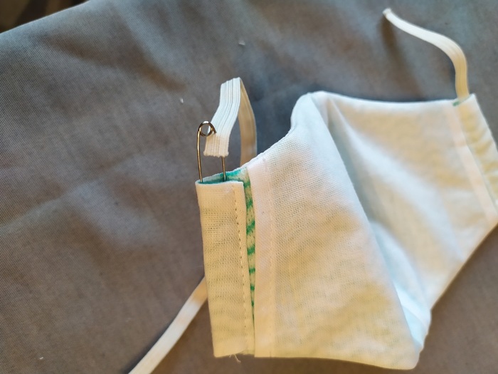 10. Осталось вставить резинку. Длина резинок 22 см. Возможно вам надо будет подкорректировать длину т.к. лицо у всех разное и резинки все тянутся по-своему. Конец резинки накалываем на булавку и просовываем в припуск шва сбоку.