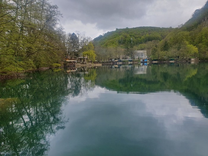 Побывали на Нижнем Голубом озере. Озеро карстовое, образовалось в результате провала. Максимальная глубина на сегодня установлена в 292 м., но это не точно. Постоянная температура 9°. Имеет и правда глубокий сине-зеленый цвет, ну и пахнет сероводородом.