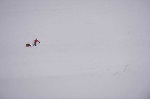 Мужчина катает своих детей на санках в Национальном историческом парке Вэлли Фордж в Пенсильвании, США, 14 марта 2017 года.