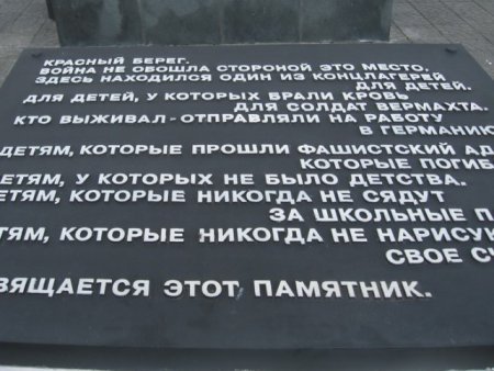 Это мемориал в деревне Красный Берег в Гомельской области. Во время войны здесь находился один из самых жутких концлагерей Второй мировой. Сюда немцы собирали наших белорусских детей в возрасте от 4 до 15 лет из соседних районов Гомельской области. Собирали для того, чтобы выкачивать у них кровь. Детская кровь предназначалась для переливания раненым немцам в госпиталях. Считалось, что детская кровь более здоровая, чистая, чем у взрослых, вот и высасывали её из детей, сколько могли.