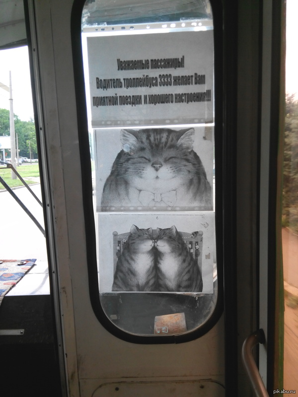 233 pikabuha Очень добрый тролейбус 11 лет назад Всем добра!!! Ехал с работы на таком - сразу настроение улучшилось) Троллейбус Кот Милота Доброта