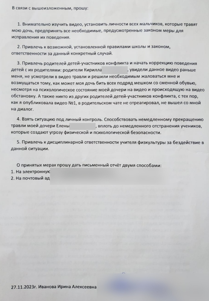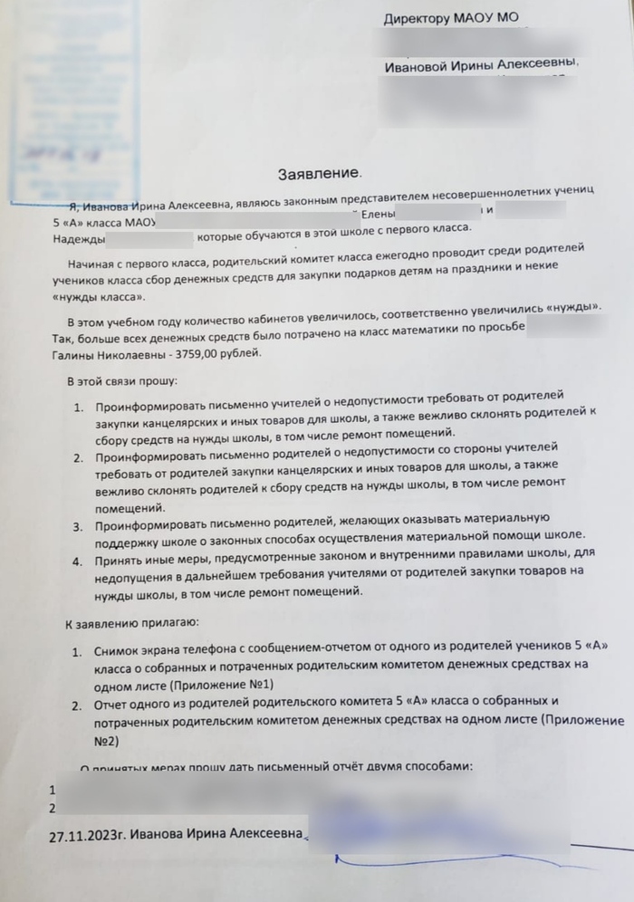 ... Вслед за обращением к директору школы о травле я прикладывала обращение о поборах, мол, какие нужды есть у класса, пожалуйста, разъясните о законных методах перечислений на эти нужды. И что вы думаете? После очередного родительского собрания, на котором я не присутствовала, очередное "предложение" скинуться на "нужды класса"