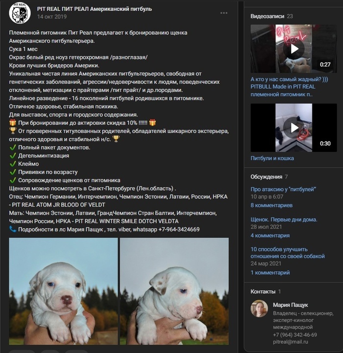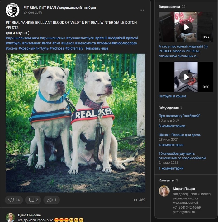 Я познакомилась с питомником Пит Реал в 2009 году. Случайно. Первой моей собакой с приставкой питомника Пит реал стал Рэм (официальная кличка PR YANKEE BRILLIANT BLOOD OF VELDT). Тогда я не вдавалась в особенности документооборота питомника PIT REAL. Я по доброте душевной помогала владельцам мамы трех питбуль-карапузов пристраивать ее щенков. Щенки пристраивались без документов, так как они родились у молодой мамы, которую люди взяли в добрые руки, а она оказалась глубоко беременной. В итоге про эту историю прознала М.Л.Пащук, руководитель питомника Пит Реал, и сообщила мне, что детям положены документы, это же чистокровные элитные питбули! В подтверждение своих слов, она прислала мне копии трех щенячьих карт на всех трех щенков.