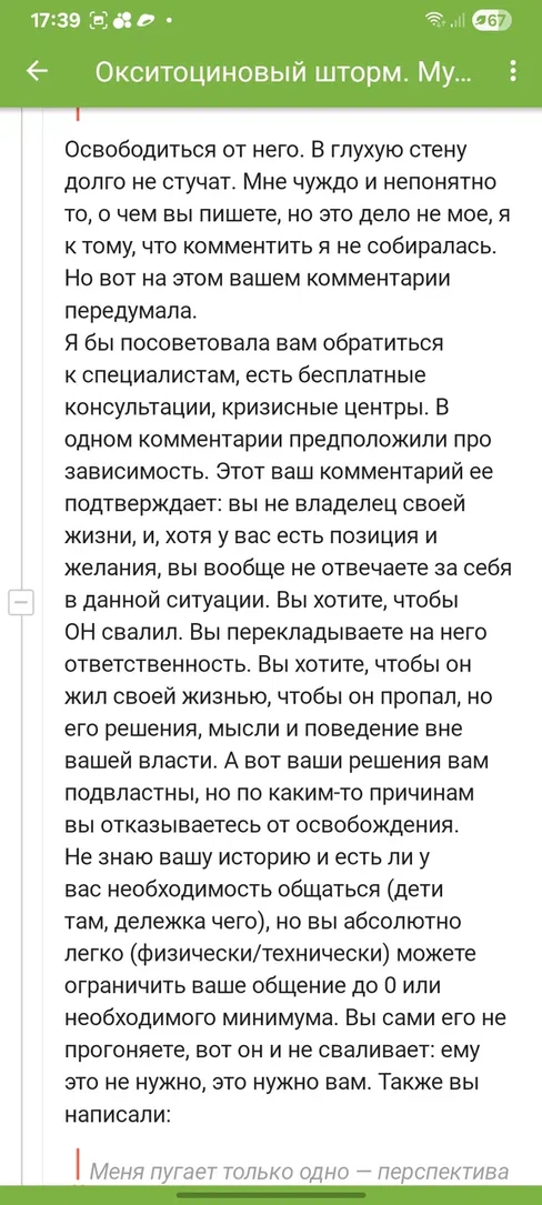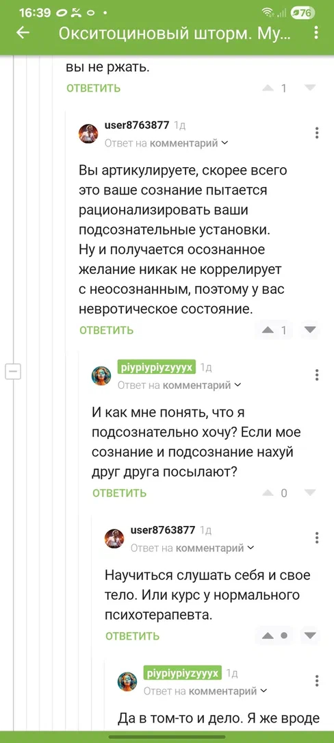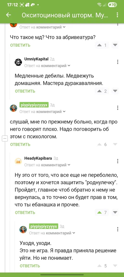 «Нахуй всё, больше никакой семьи» — «больше не надо семьи» — «больше не надо такой, как у меня была» — «я бы хотела семью» — «я бы хотела семью из двух взрослых людей» — «я хочу взрослую семью» — «а какую семью я хочу? Какая бы была идеальной?»