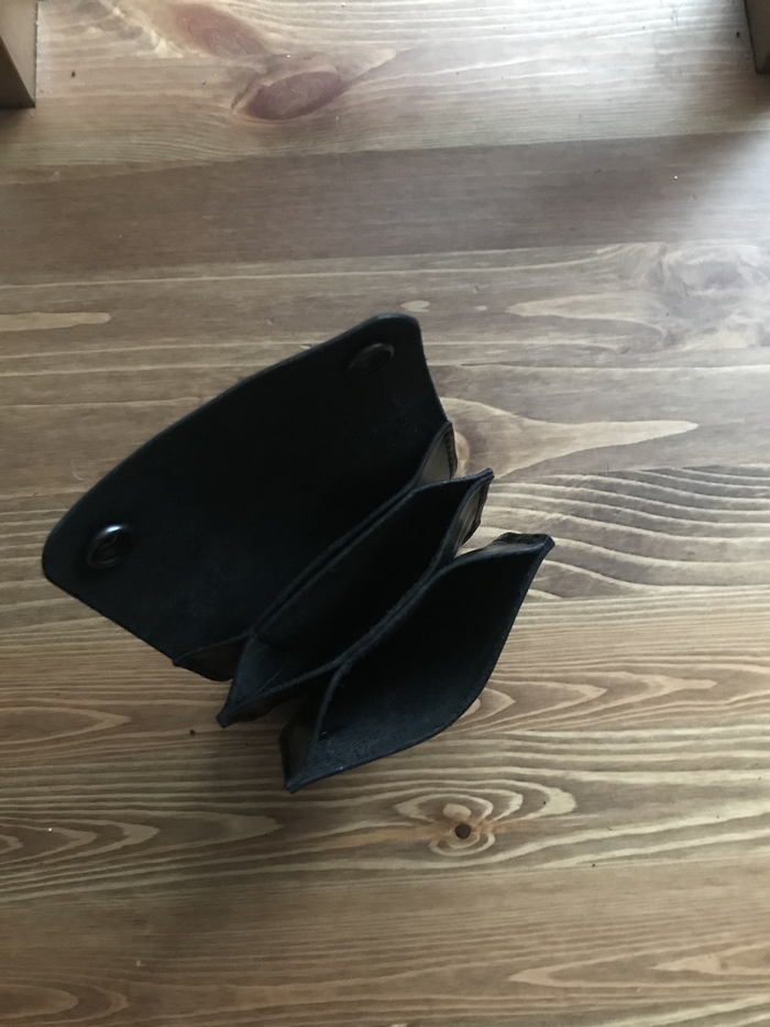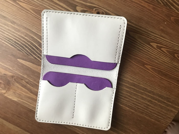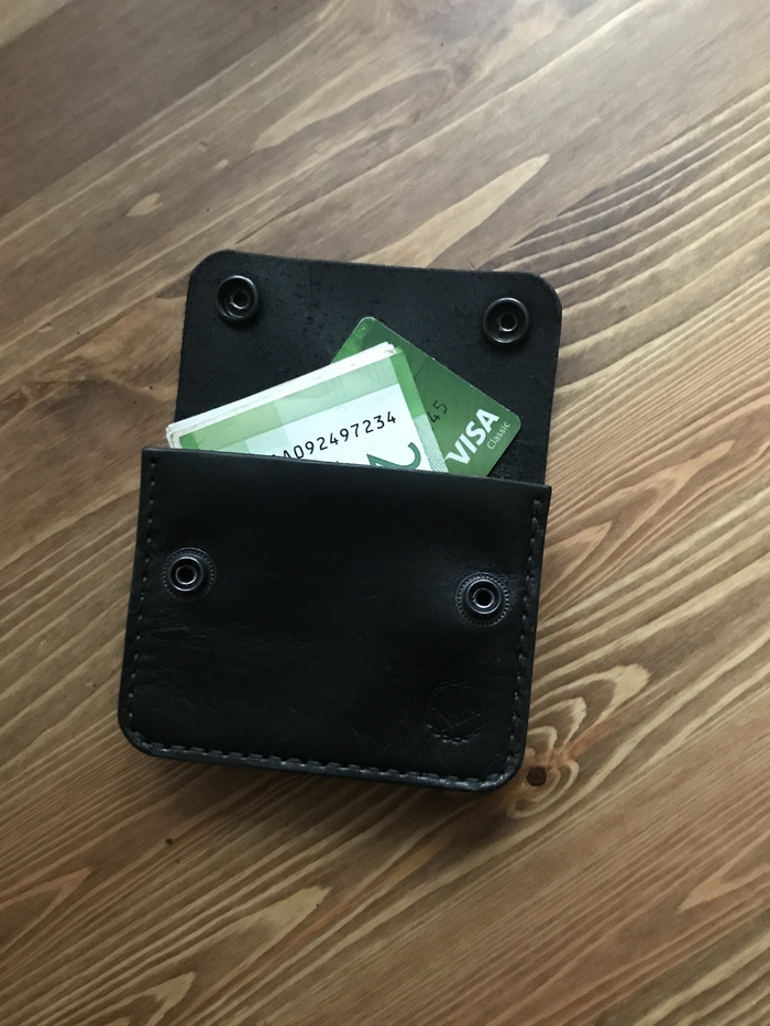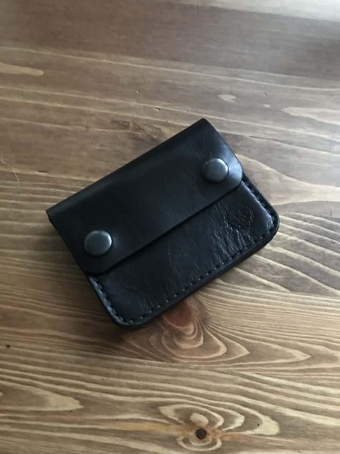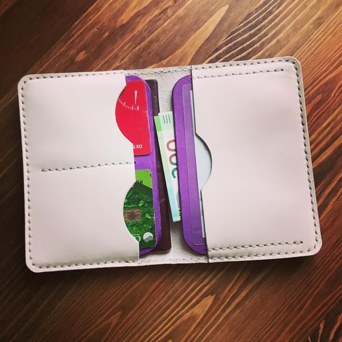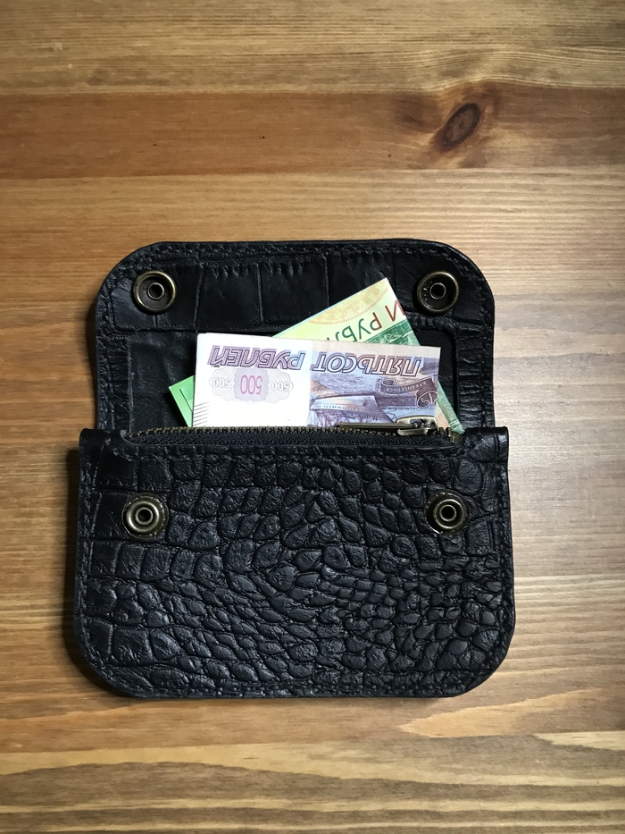 Прилетел с одного сайта с частными объявлениями небольшой заказик. Клиентка захотела вот такой небольшой кошелёк. Кожа КРС с тиснением под кроко растительного дубления. Один отдел под карты и один под мелочь