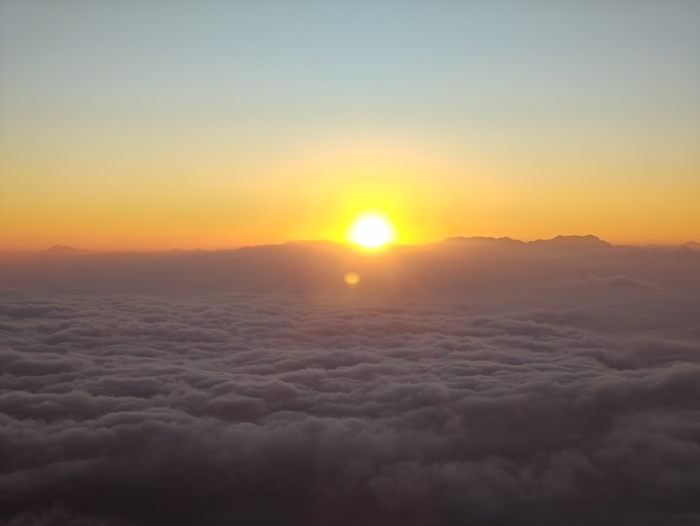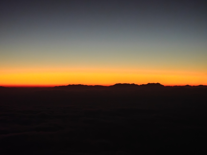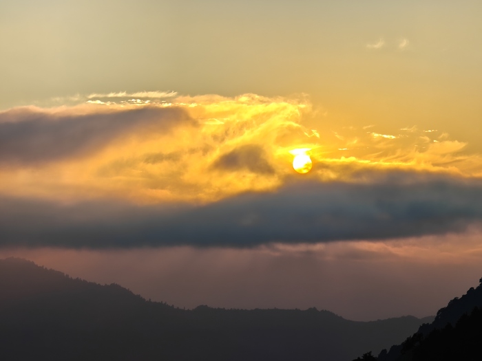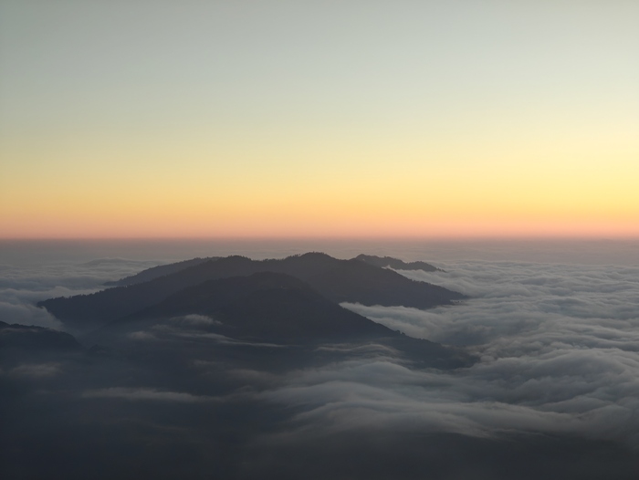 Около 17-20 почти все вышли на улицу лицезреть закат. Мы высоко, а потому пелена вечерних облаков теперь сильно ниже. Вершины перекрасились в ярко оранжевый цвет, пока солнце не растворилось в этой облачной пелене.