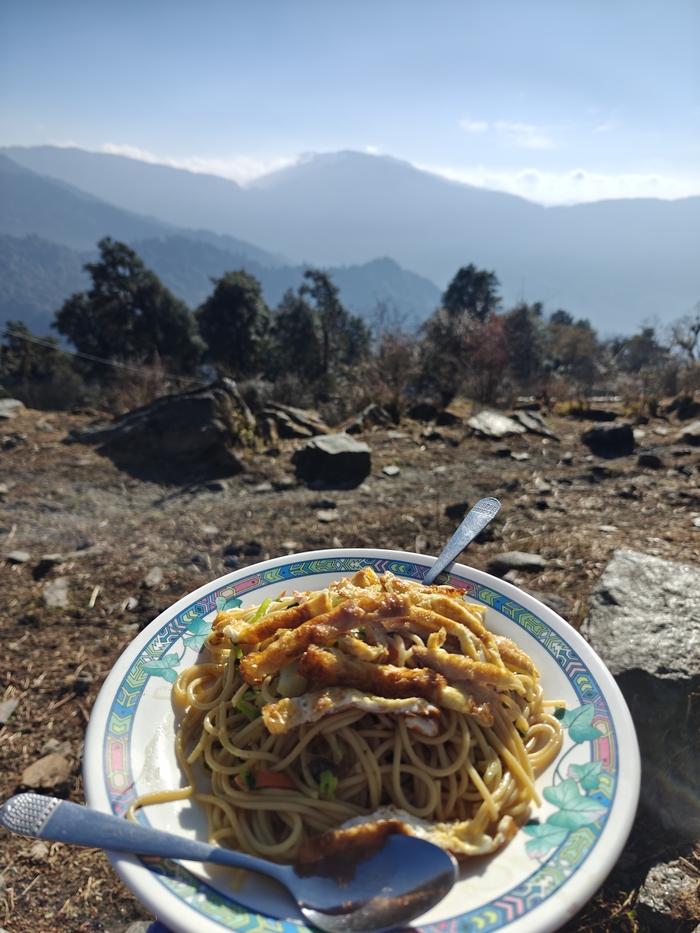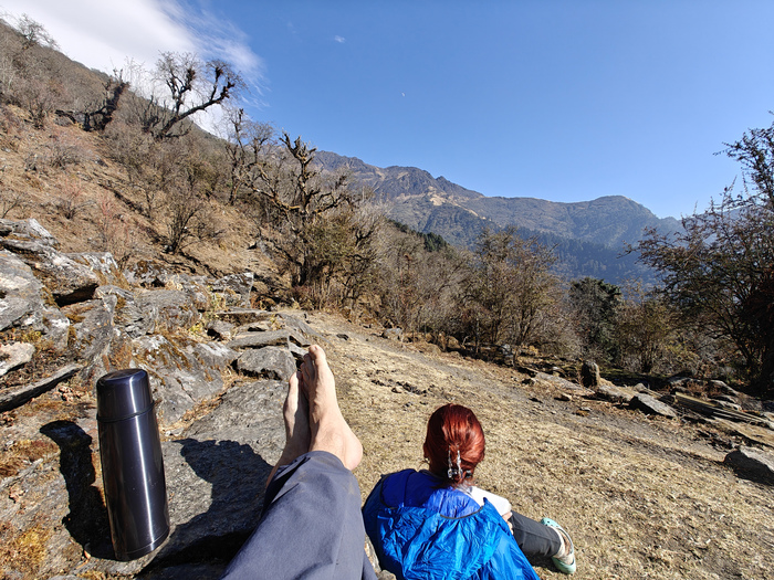 Высота, кстати, уже 3000 метров над уровнем моря. Заказали на обед две порции fried noodles с яйцом (стоимость около 600-700 NPR, точно не запомнил) и отправились поваляться на камнях рядом с лоджем, они к этому часу здорово прогрелись. Тут же познакомились с женщиной из Израиля, она приехала в Непал с йога туром и после решила сходить в трек, уж очень ей тут понравилось.