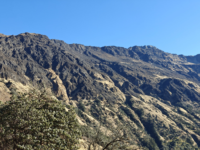На последней фото склон, где на картах есть тропа от Khopra Danda до Dobato, но там недавно случился несчастный случай, одна женщина пошла этой тропой и сорвалась, ее нашел внизу пастух. Непальцы, сопровождавшие немку так же сказали, что тропа там местами опасная и лучше ей не ходить. Уже перед самой Khopra пейзаж резко меняется и перед тобой предстает какая-то космическая красота...