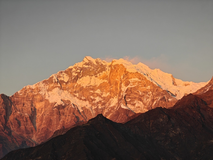 Проснулись рано, чтобы подняться на Poon Hill затемно и поймать все краски неба, которые обещали быть безумно красивыми. Подъем на Poon Hill платный, кажется 200 NPR за человека, в начале тропы небольшое КПП. В неспешном режиме поднялись минут 40 на вершину, оделись и стали любоваться и фотографировать. Потихоньку подтягивались и люди.