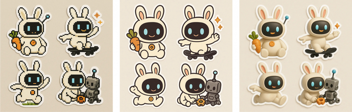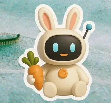 Сделай набор стикеров в одном стиле. Главный персонаж — милый робот с ушами кролика, белый костюм, чёрное лицо с голубыми глазами. Позы: держит морковку, едет на скейтборде, машет рукой, прыгает вверх. Стилистика — мягкая 3D-иллюстрация, картинки квадратные. Фон должен быть прозрачный