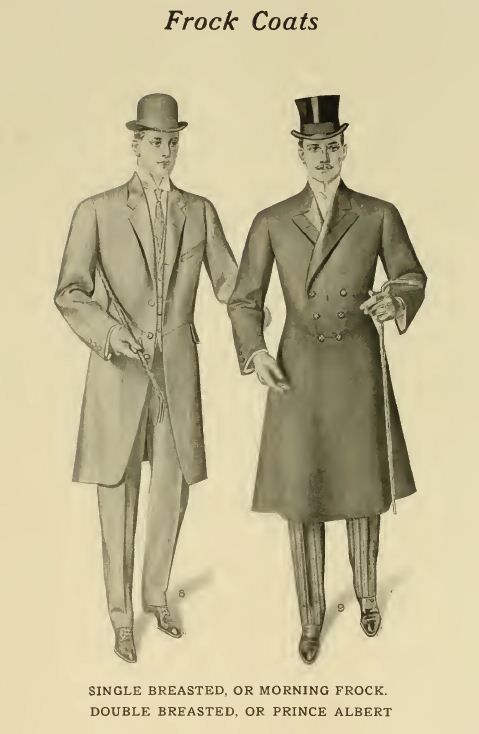 The morning dress for gentlemen is a black frock coat or a black cut-away, white or black vest, according to the season, gray or colored pants, plaid or stripes according to the fashion, a high silk stove pipe hat and a black scarf or necktie. A black frock coat with black pants is not considered a good combination.. The morning dress is suitable for garden parties, Sundays, social teas, informal calls, morning calls and receptions.
