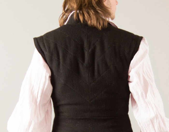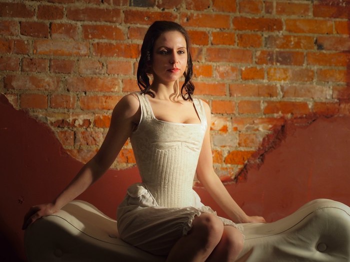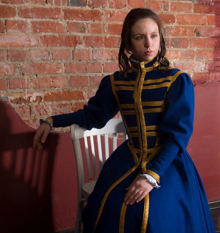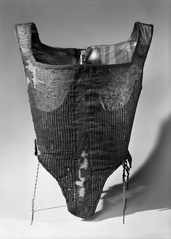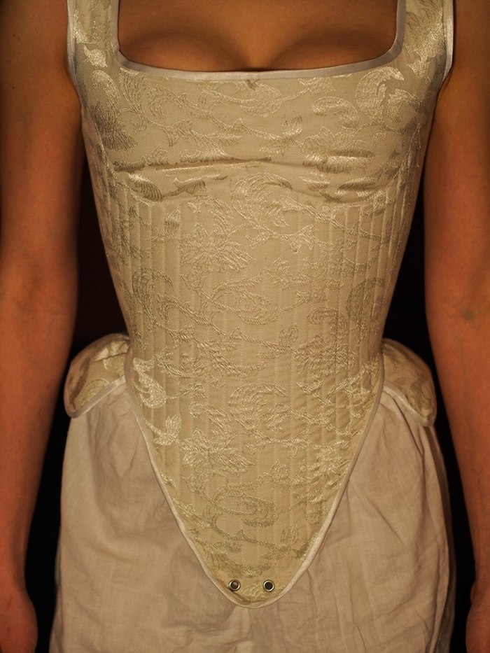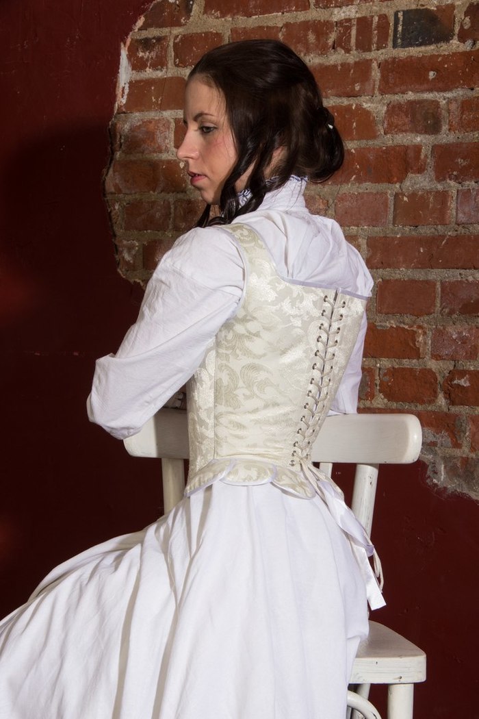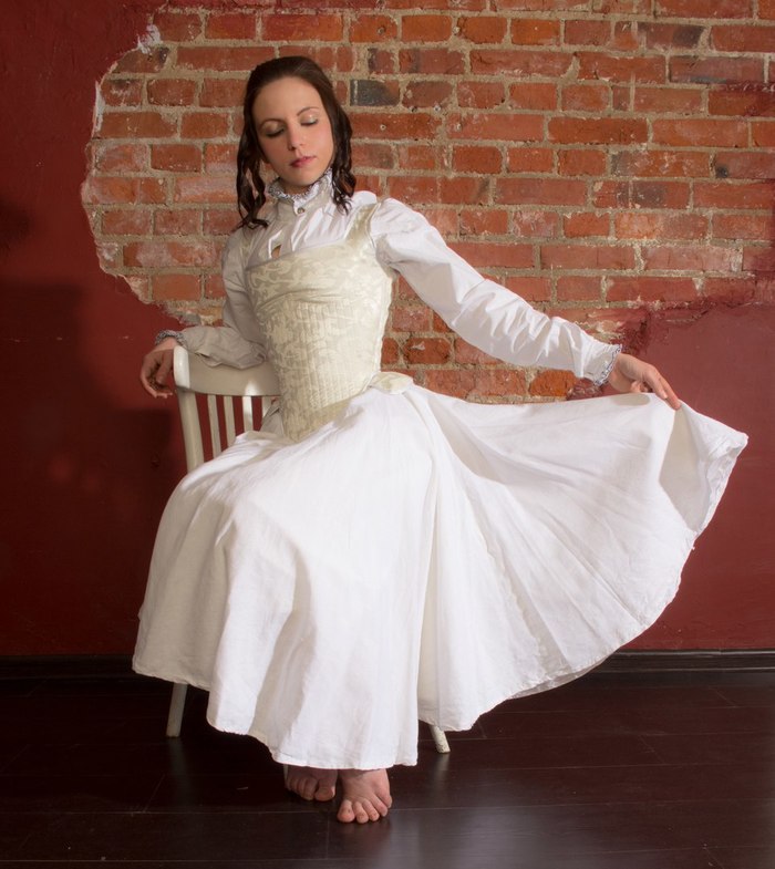 Корсет. Хороший корсет задает тон всему остальному костюму. Оригинальный довольно специфичен. Во-первых, он скорее убирает фигуру, чем подчеркивает ее. Во-вторых, в отличие от более поздних образцов, он заходит ниже талии только спереди, оставляя значительную свободу движения. Мы использовали жаккардовую ткань для верха и мягкую хлопковую подкладку. Внутрь пошли стальные планшетки спереди и металлические кости-пружинки на бока.