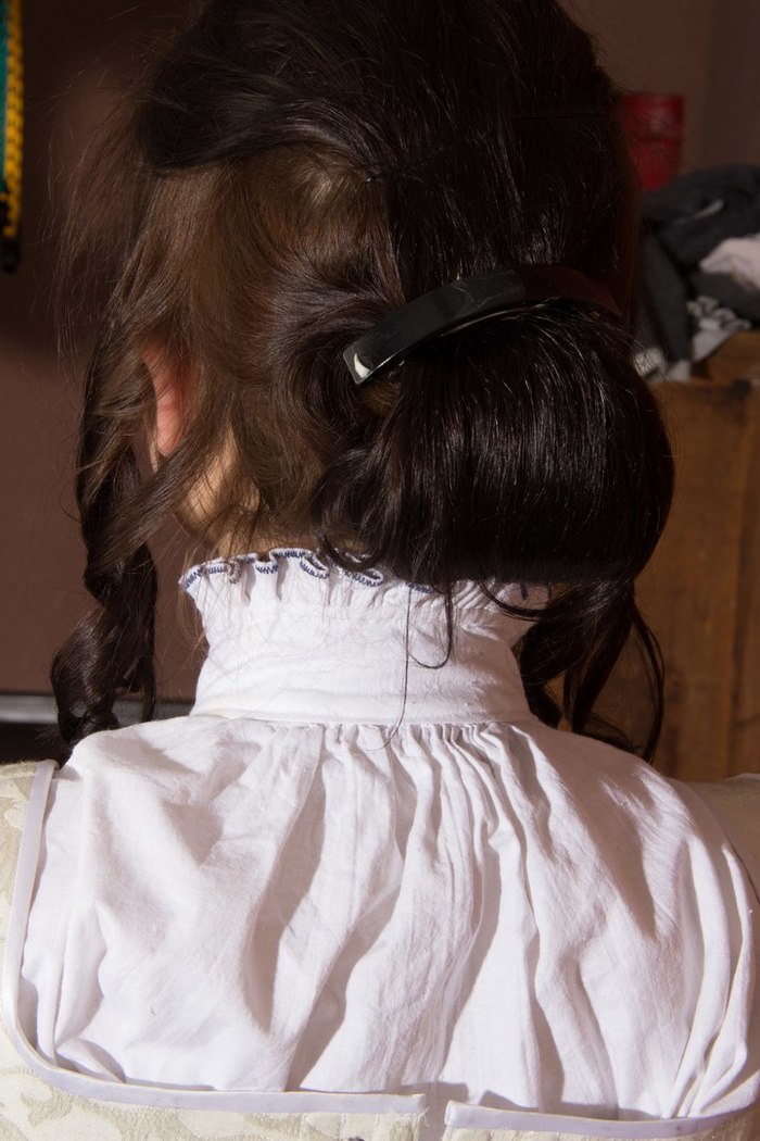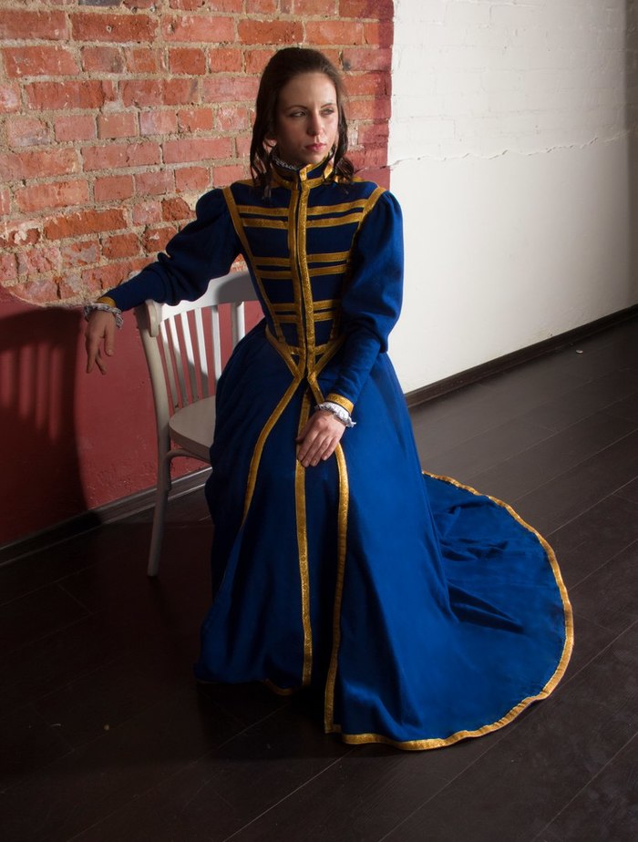 Платье пришлось немного упростить в угоду практичности. Бархат заменили на тонкую костюмную шерсть. Отказались от второй декоративной пары рукавов и помпезного длинного шлейфа. Маленький, впрочем, оставили - с ним все-таки гораздо красивее.
