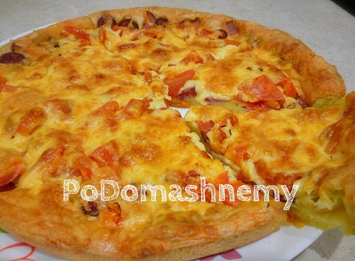10. Тесто немного притрусите мукой и с помощью скалки перенесите его на форму, распределив по всей поверхности и сформировав бортики высотой 5-6 см.