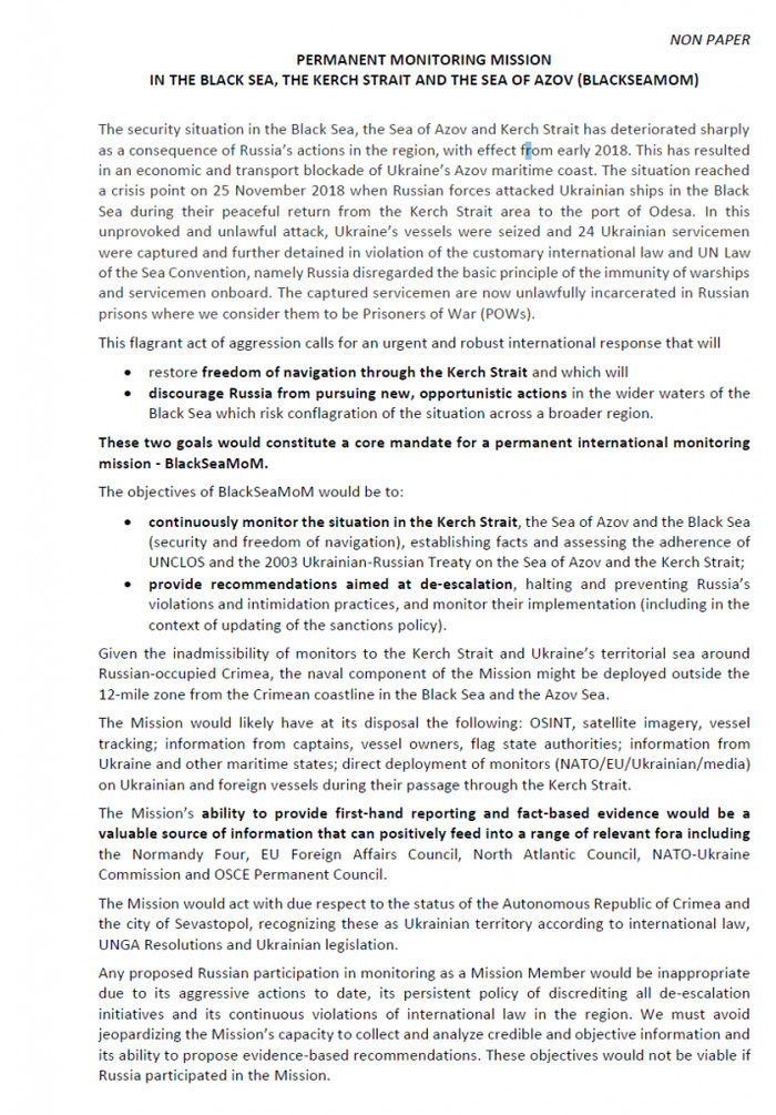 В сеть Интернет недавно попал весьма интересный документ с проектом размещения в Черном и Азовском морях постоянной мониторинговой миссии на базе сил ЕС и НАТО, которые должны, действуя совместно с ВМСУ и пограничной службой Украины, оказывать давление на ситуацию в Черном и Азовском морях, а также в Керченском проливе. Проект называется "Постоянная мониторинговая миссия в Черном море, Керченском проливе и Азовском море" (BlackSeaMoM).