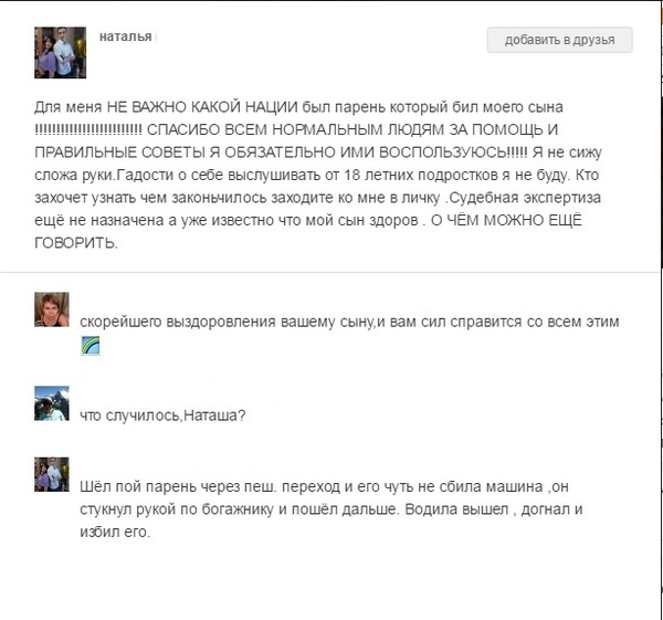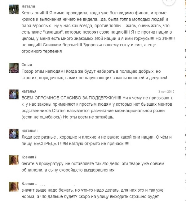 Далее - Куча свидетелей, которые всё видели и все скажут, видели как били её сына, куда то исчезли, по окончании - они ничего не видели и говорить ничего не хотят. Да потому что не было их там, зато в одноклассниках они и матом крыли и посылали всех куда - подальше, эти дамы за 40. Сука ненавижу одноклассники.