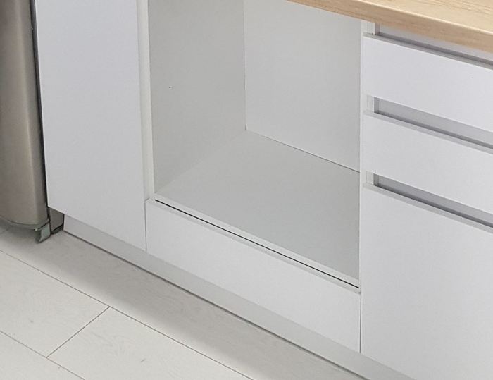 Идем дальше. Нижний модуль под духовой шкаф. Обратите внимание на зазор между основанием духовки и фасадом.