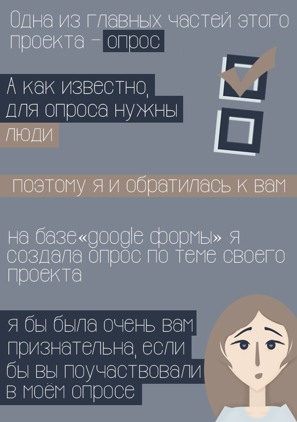 Доброго времени суток, Пикабу. Нужна твоя помощь для моего исследовательского проекта. Это займёт у вас максимум 3 минуты, нужно всего лишь пройти социологический опрос (всего 17 вопросов). Буду очень вам признательна!